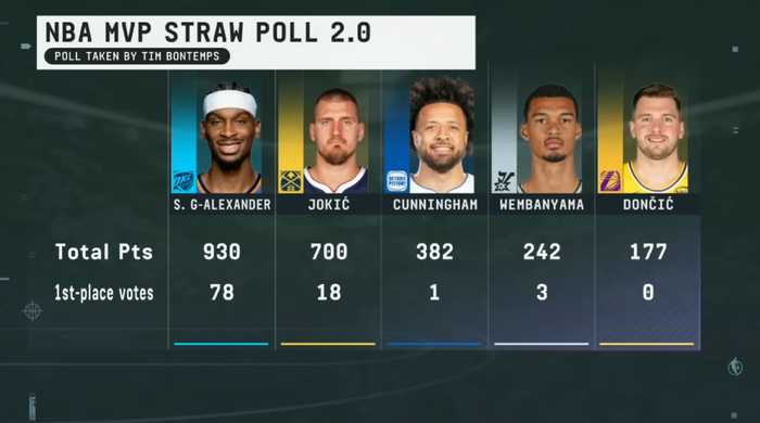 ESPN邀请100名记者进行本赛季常规赛MVP第二次非正式民意调查,亚历山大获得78张第一选票,是唯一一位获得全部选票的球员,总分930排名第一。约基奇、坎宁安、文班亚马分列二至四位。湖人球员东契奇没有获得一张第一选票,得到两张第二选票,总分177排名第五。