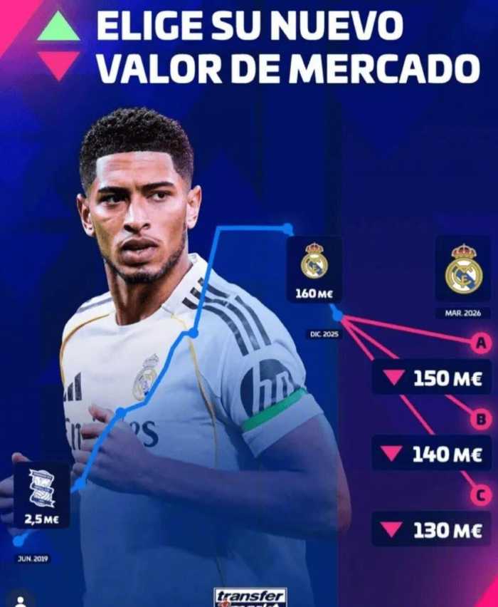 德国转会市场近期将更新西甲球员的身价,贝林厄姆的身价将确定会下跌。